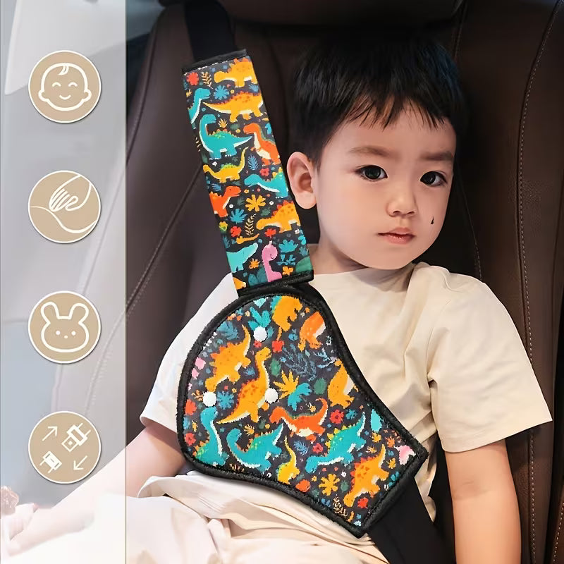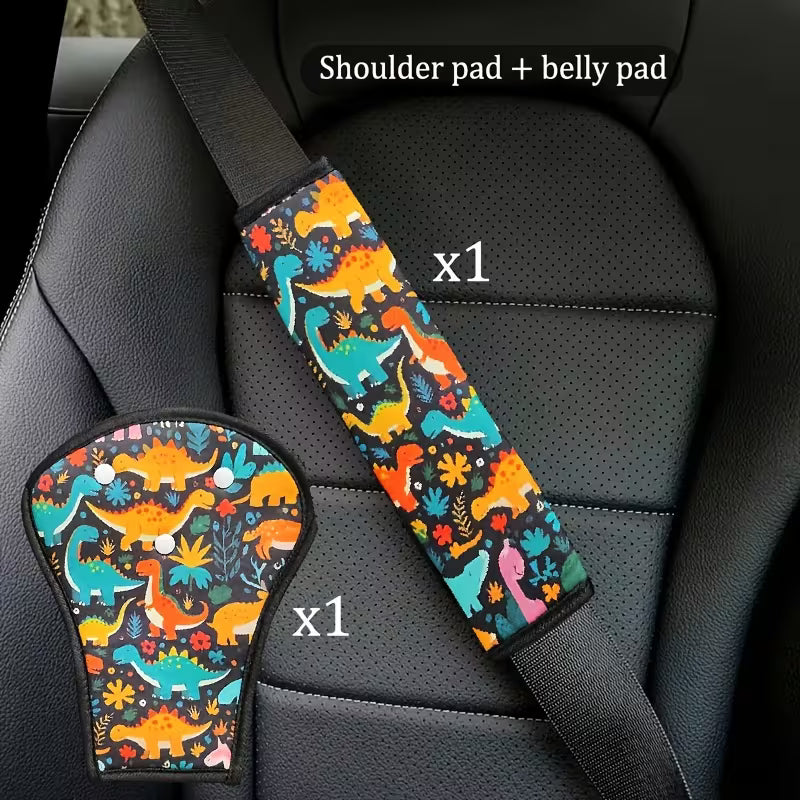 Cute and comfortable seat belt protector set with padded shoulder and belly cushions in fun dinosaur, astronaut, and cartoon patterns, made from soft polyester and easy to fix on any car seat belt for safer, cozier rides for kids or adults.